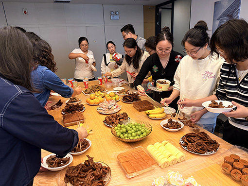 作为集团延续多年的文化符号,本次冷餐会在传统配置上注入新意。会场长桌上,苏式月饼承载中秋记忆,创意水果拼盘勾勒团圆色彩,鲜榨果汁与特色饮品在舌尖跳跃,每一处细节都诠释着“舌尖上的关怀”。这些精心筹备的细节,不仅是对传统节日的致敬,更是集团“工作有温度、生活有甜度”企业文化的具象化表达。